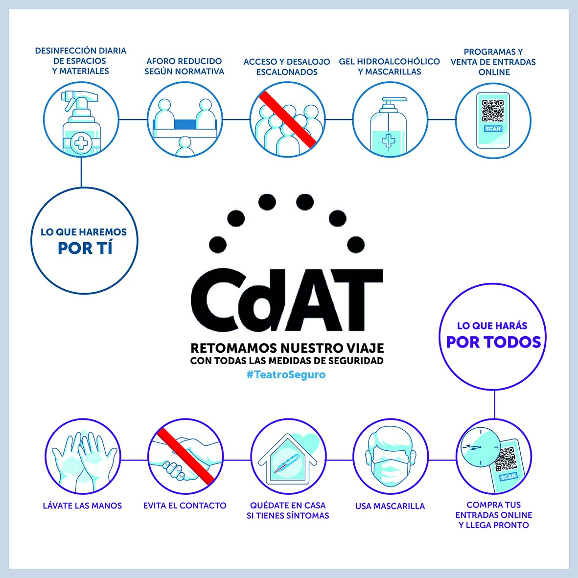 Ante el abandono de nuestro ministerio (¿Alguien sabe dónde esta el ministro de cultura?), el sector cultural ha sido uno de los más golpeados durante esta crisis, y a su vez, es uno de los sectores que ha asumido mayor responsabilidad para generar seguridad y confianza, poniéndose al frente en la definición de las medidas de seguridad requeridas. Así que mientras las terrazas, los buses, los aviones y demás priorizan el factor económico y siguen rebosantes de gente, en los teatros encontrarás el respeto y el espacio que estos tiempos necesitan.